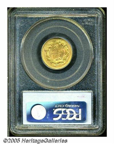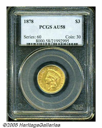 <B>1878<$3> AU58 PCGS.</B></I> Because of the outstanding luster usually seen on 1878 threes, there is still a significant amount remaining on this piece even though it has been lightly handled. Each side shows a modest overlay of deep green-gold color, and there is just a touch of wear on the highpoints of the design. A faint reddish-brown spot appears on the right side of the reverse, along the outer edge of the wreath. Altogether an attractive and worthwhile type coin.