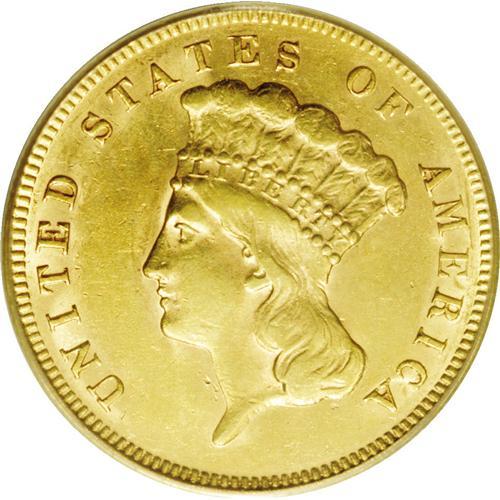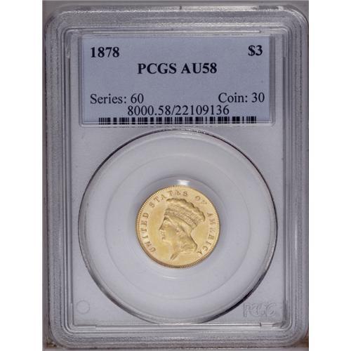 1878 $3 AU58 PCGS. Bright surfaces and well struck, mo 1878[$3] AU58 PCGS.