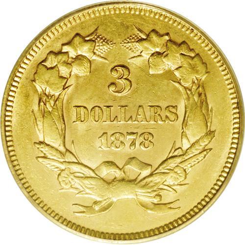 <B>1878<$3> AU58 PCGS.</B></I> Bright surfaces and well struck, most of the original mint luster still remains. This coin is very close to a technical Mint State grade.