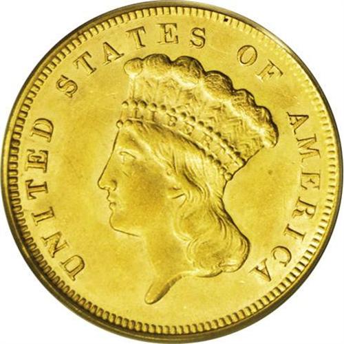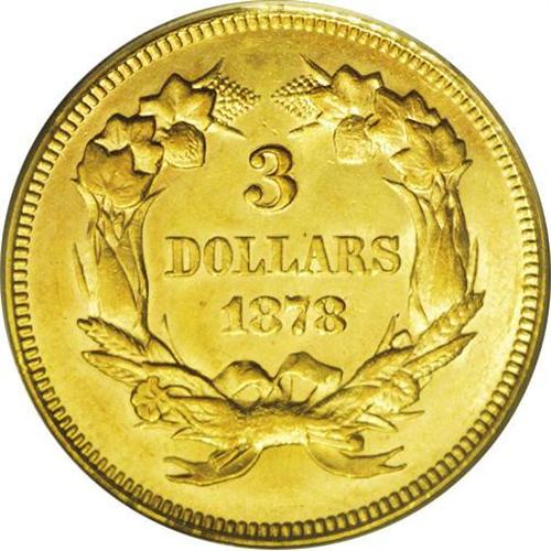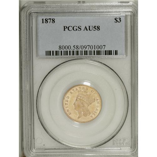 <B>1878<$3> AU58 PCGS.</B></I> For the collector who does not wish to pay a Mint State price for a pleasing piece of this type, a well-preserved near-Mint example is the best option. The present coin has a hint of highpoint friction that keeps it from the uncirculated grades, but the luster of the yellow-gold surfaces is largely undisturbed, the strike is sharp, and few distracting marks are apparent on the devices or in the fields. Highly appealing.