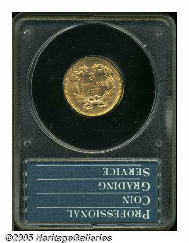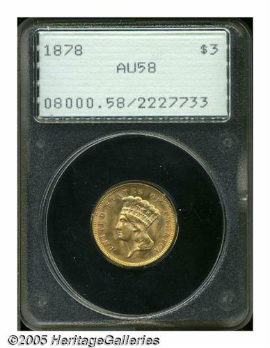 <B>1878<$3> AU58 PCGS.</B></I> The upper right wreath and the final letters in DOLLAR are nicely die doubled. Beautiful khaki-gold and pink coloration adorns each side of this richly lustrous example. A few small marks at 5 o'clock on the reverse, otherwise undisturbed. Housed in a first-generation PCGS holder.
