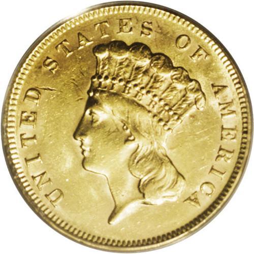 <B>1878<$3> AU58 PCGS.</B></I> This is a common date in the series and, along with 1854 and 1874, an ideal candidate for the type collector. This example is a frosty near-Mint specimen with brilliant light yellow luster with subtle pink toning and a tiny copper spot on the reverse. The obverse fields are lightly abraded while the reverse fields are pristine.