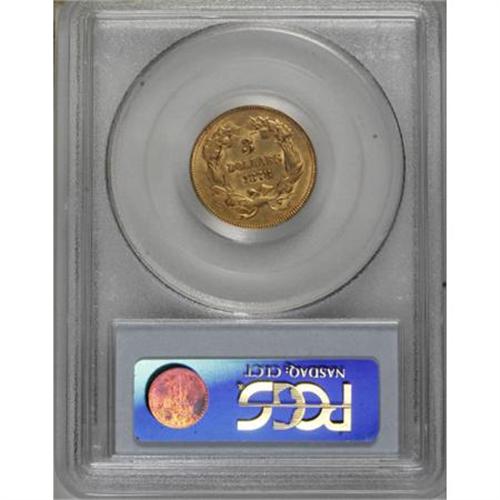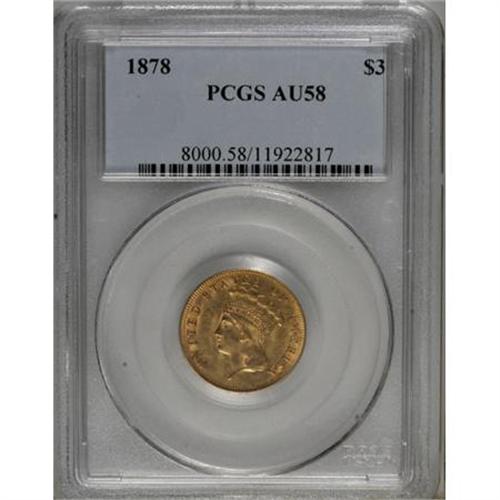 <B>1878 $3 AU58 PCGS.</B></I> Bright yellow-gold and reddish-tan surfaces retain generous luster, and reveal a minimum of marks. Well struck, except for the usual softness on the bowknot.<BR><BR><B>Coin Engraver:</B> James B. Longacre<BR><BR><b>Shipping:</b> Coins & Currency (<a target="_blank" href="http://www.heritageauctions.com/common/shipping.php">view shipping information</a>)