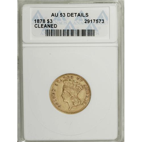 <B>1878 $3 --Cleaned--ANACS. AU53 Details.</B></I> A patch of hairlines is present near UNITED, but overall, this is a suitable type coin that has witnessed only brief circulation. Obverse wear is limited to Liberty's forehead and hair.<BR><BR><b>Shipping:</b> Coins & Currency (<a target="_blank" href="http://www.heritageauctions.com/common/shipping.php">view shipping information</a>)