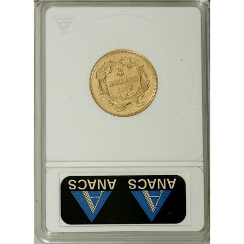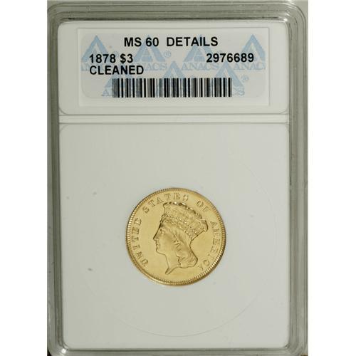 <B>1878 $3 --Cleaned--ANACS. MS60 Details.</B></I> A wipe from a jeweler's cloth gives this example suspiciously prooflike fields, but the sharply struck devices are lustrous and unworn.<BR><BR><b>Shipping:</b> Coins & Currency (<a target="_blank" href="http://www.heritageauctions.com/common/shipping.php">view shipping information</a>)