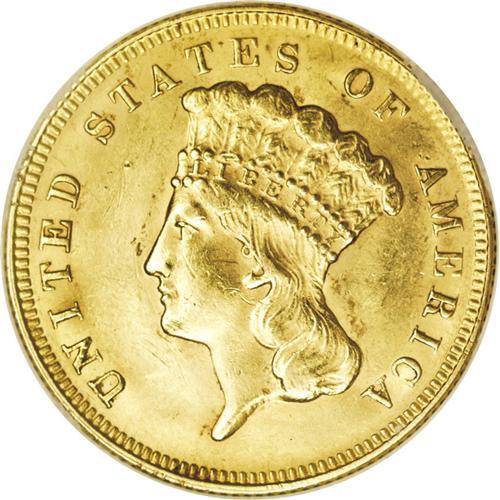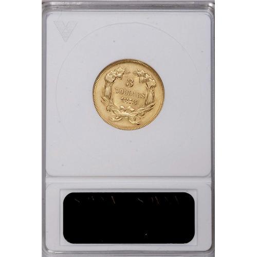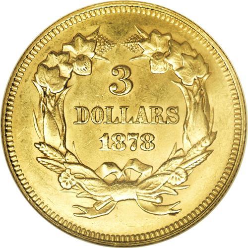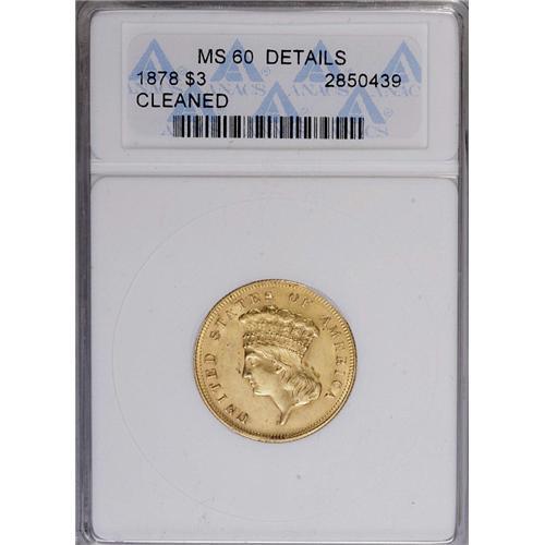 <B>1878<$3>--Cleaned--ANACS. MS60 Details.</B></I> Although this example has been lightly cleaned and exhibits faint hairlines, the overall eye appeal is still quite excellent. The surfaces have bright greenish-gold color with frosty luster. A few scattered abrasions are present, including those on Liberty's cheek.