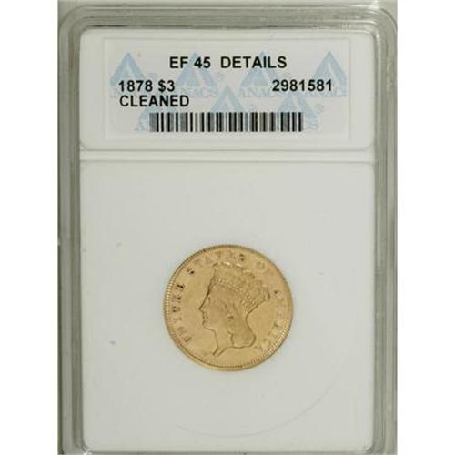 <B>1878 $3 --Cleaned--ANACS. XF45 Details.</B></I> NGC Census: (48/4181). PCGS Population (94/4389). Mintage: 82,324. Numismedia Wsl. Price for NGC/PCGS coin in XF45: $1,015. (#8000)<BR><BR><b>Shipping:</b> Coins & Currency (<a target="_blank" href="http://www.heritageauctions.com/common/shipping.php">view shipping information</a>)