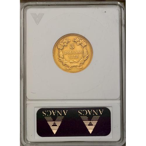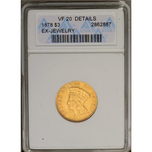 <B>1878<$3>--Ex-Jewelry--ANACS. VF20 Details.</B></I> Evidence of soldering appears above the second T in STATES. A worn later-date three dollar gold piece with mustard-yellow surfaces.