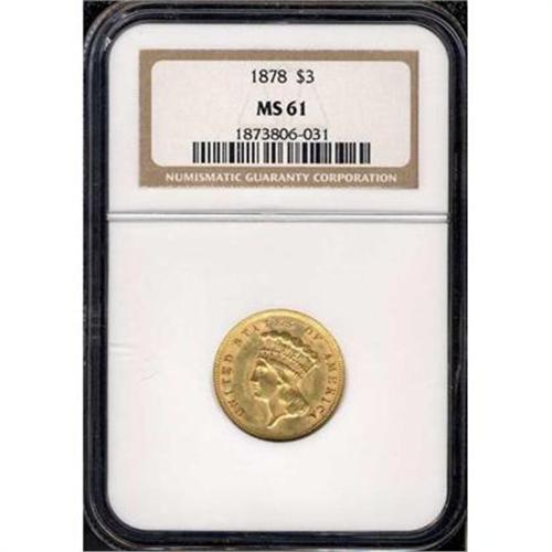 <b>1878 $3 Gold. NGC graded MS61.</b> Sharply struck and lustrous with toning <b>(PCGS # 8000)</b>