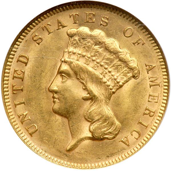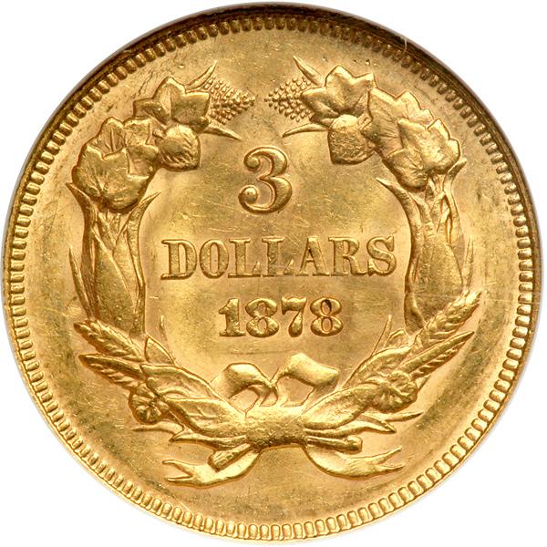 1878 $3 Gold. NGC graded MS-62. Untoned and frosty. The $3 gold piece was authorized by the Act of February 21, 1853, a very important piece of legislation from a numismatic viewpoint, an act which also affected the silver coinage, namely the reduction in weight of the half dime, dime, quarter, and half dollar, and the addition of arrows alongside the date to indicate the new standard. At the time of its introduction, 1854, the $3 had as a close companion -- the long established $2.50 quarter eagle. The series ended in 1889 (PCGS # 8000) .