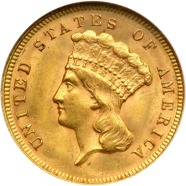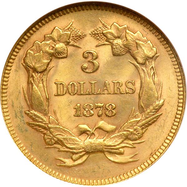 1878 $3 Gold. NGC graded MS-62. Lightly toned and frosty, the color a warm reddish golden hue (PCGS # 8000) .