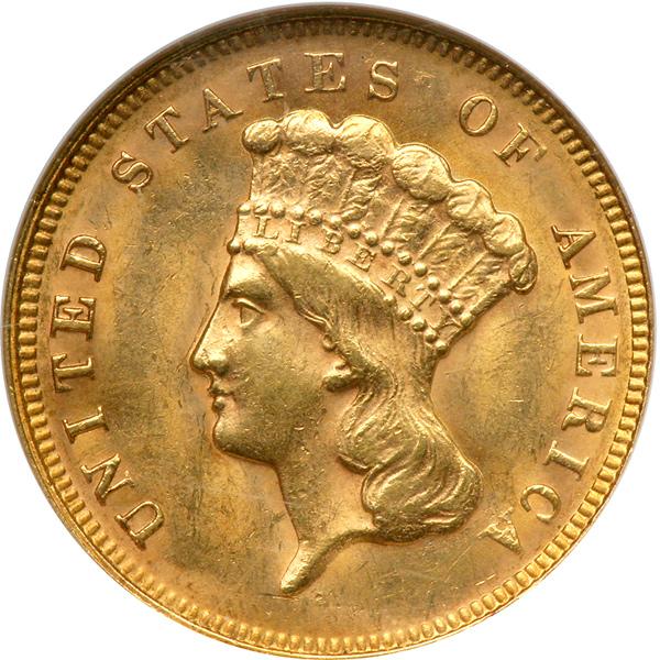 1878 $3 Gold. NGC graded MS-63. A hint of light gold tone. One of the better made gold-surfaced coins whose desirable depth of strike complements the equally choice mint bloom (PCGS # 8000) .