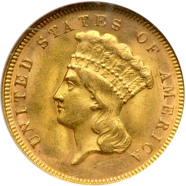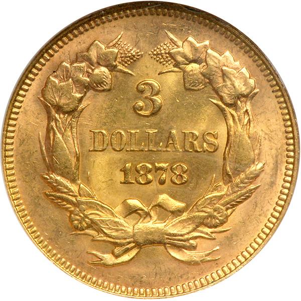 1878 $3 Gold. NGC graded MS-63. A hint of light gold tone, warm in its lovely saturation and beaming bright from the underlying frosted surface. The reverse displays an "agricultural wreath" enclosing 3 DOLLARS and the date. The reverse wreath was later used on the Flying Eagle cents of 1856-1858. As is demonstrated, Longacre liked to copy his own work (PCGS # 8000) .