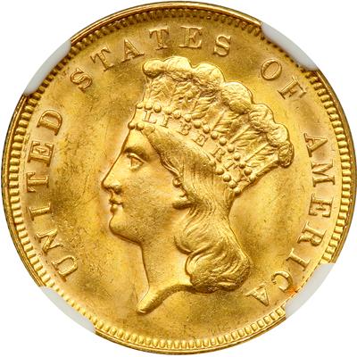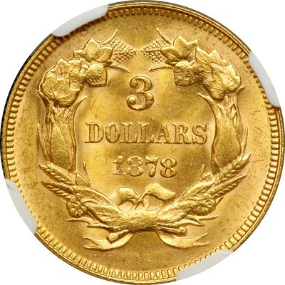 1878 $3 Gold. NGC graded MS-65. A lovely lustrous specimen shimmering with mint frost. An ideal coin for a gem quality 12 piece type set. The resplendent example offered here not only surpasses the normally seen luster woes, but its sparkling surfaces border on an even higher grade. In fact, only scattered tiny marks can be seen with the aid of magnification. Struck with systematic exactness throughout excepting the usual weak areas at the ribbon bow of the wreath along a few topmost hair curls worn by Liberty. Pop 148: 53 in 66; 17 in 67. In a new NGC 4 pronged holder (PCGS # 8000).