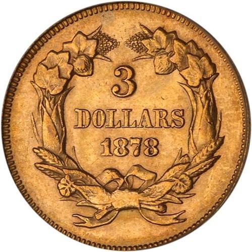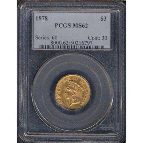 <b>1878 $3 Gold. PCGS graded MS62.</b> PCGS Pop: 870. A choice mid-level coin for the Type, this 1878 displays nice warm golden frostiness whose surface is mostly untoned, with sharp detail including nice hair on Liberty. The three-dollar gold piece was authorized by the Act of February 21, 1853. The coin was first struck in 1854. It was never popular and saw very little circulation. Many were later melted, as late as the 1930s <b>(PCGS # 8000)</b> <i>