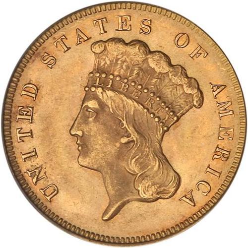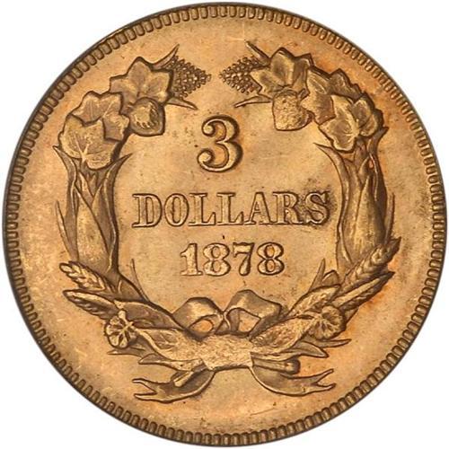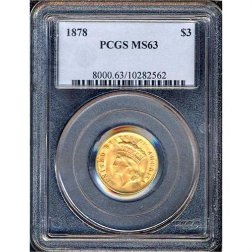 <b>1878 $3 Gold. PCGS graded MS63.</b> The golden color is especially vivid on this popular-date 1878 $3 gold coin, with reddish hues assuring it of a starring role in any choice gold Type set <b>(PCGS # 8000)</b> <i>