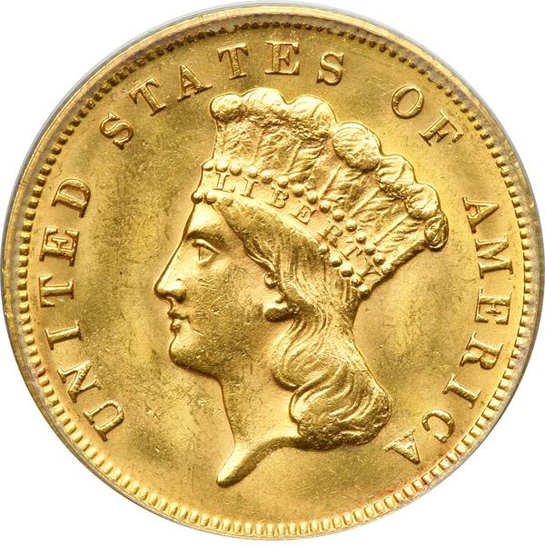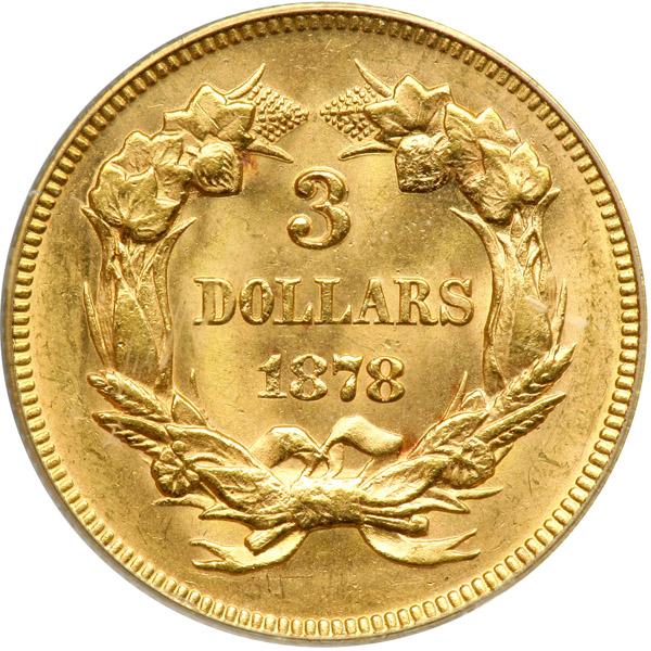 1878 $3 Gold. PCGS graded MS-63. A very choice example with unbroken mint luster throughout, the kind that gleams and ripples across the surface. Without the least qualm, we give our opinion, a Premium Quality coin for the given grade (PCGS # 8000) .