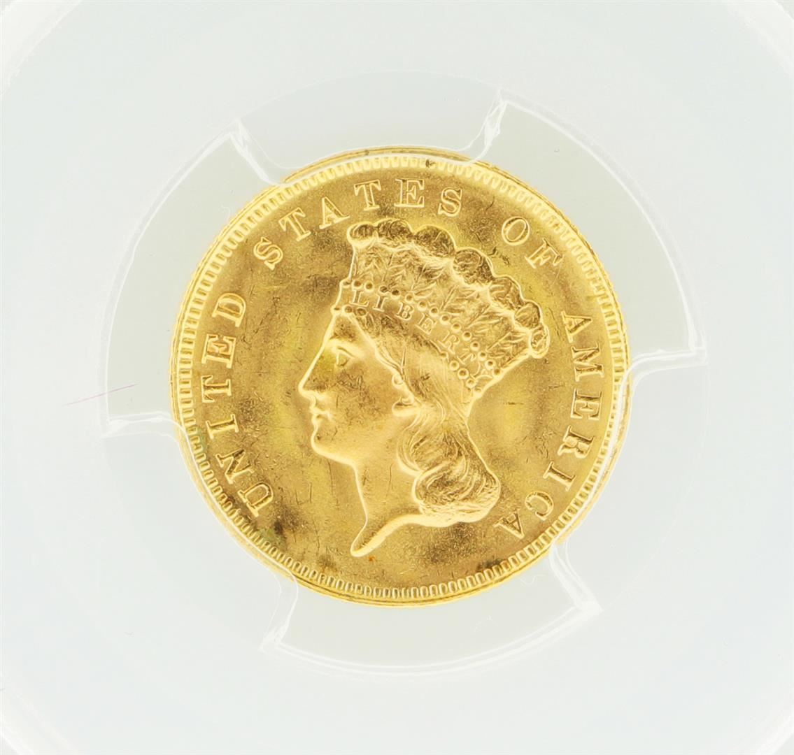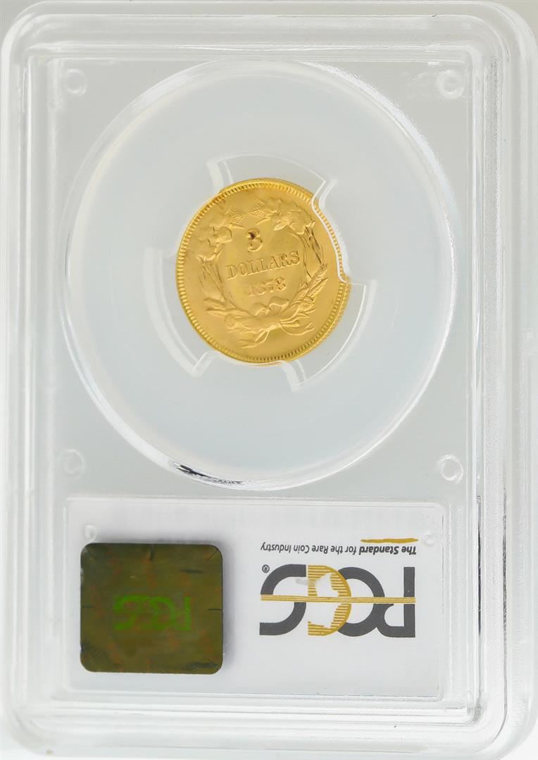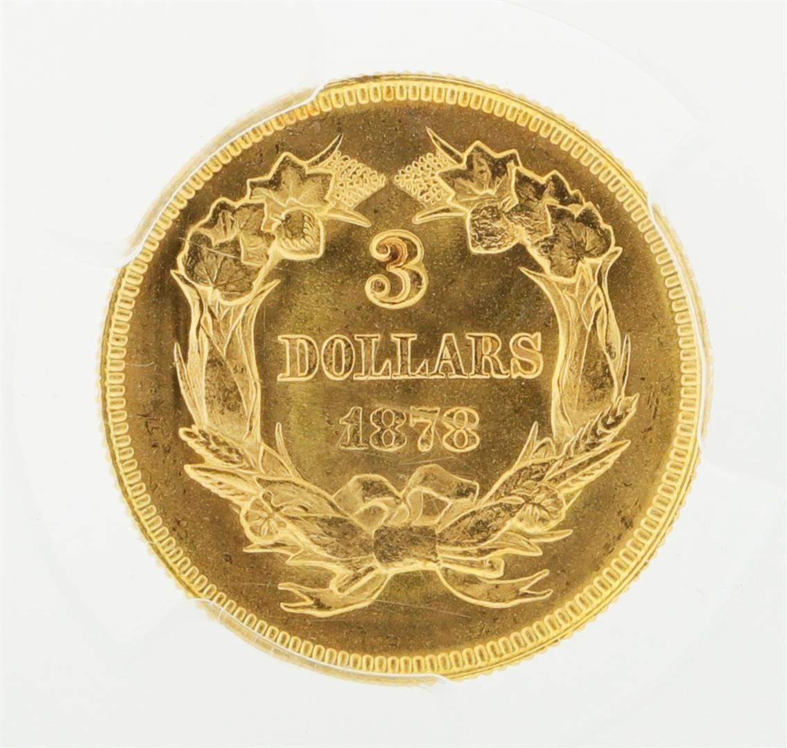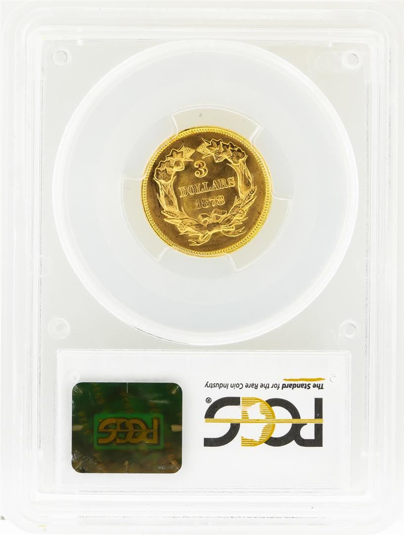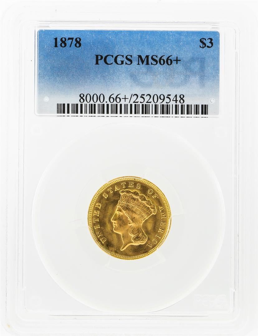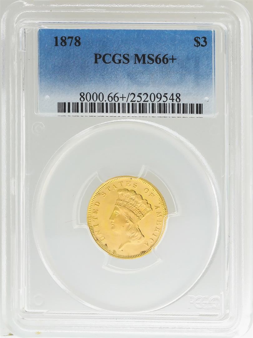 1878 $3 Indian Princess Gold Coin PCGS Graded MS66+. The 1878 is chronologically last of three generally accepted type issues for the three dollar gold series, this issue saw more than 82,000 pieces produced. For the collector who wants to have an outstanding representative of this type coin, this PCGS MS66+ is an excellent choice. The obverse is bright yellow with a characteristic swirling luster, while the reverse peripheral adds a slight hint of copper alloy for character. Preservation is marvelous even by Premium Gem standards, hence the Plus grade. PCGS Graded.