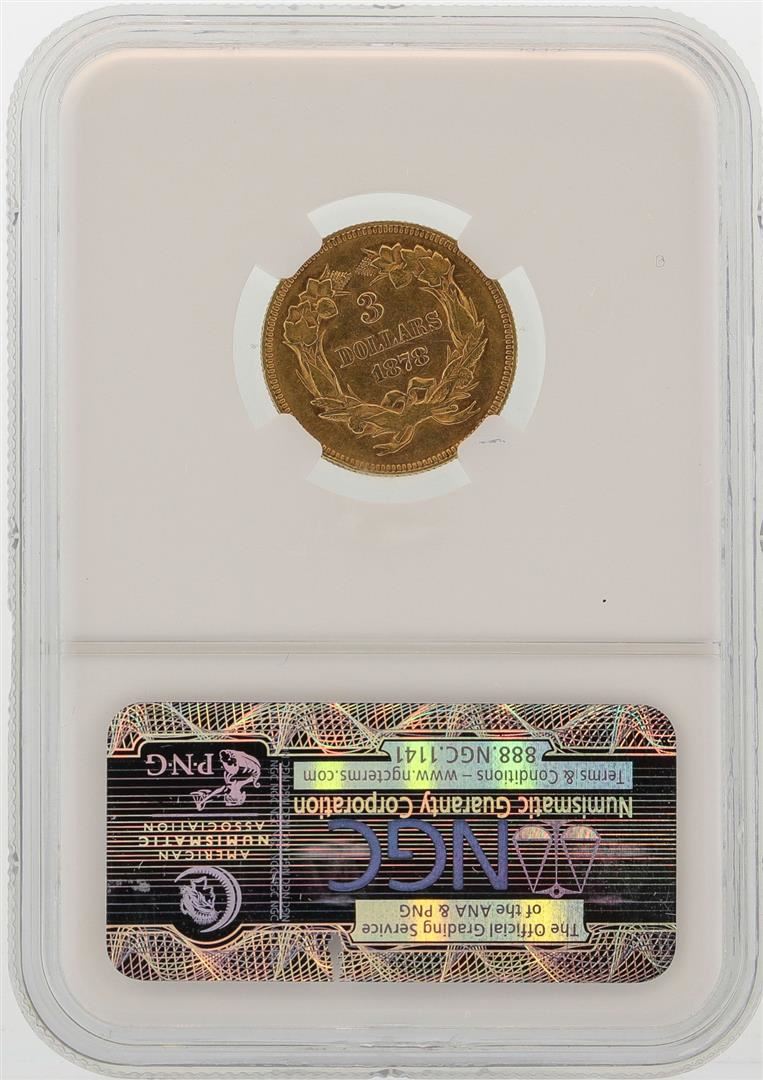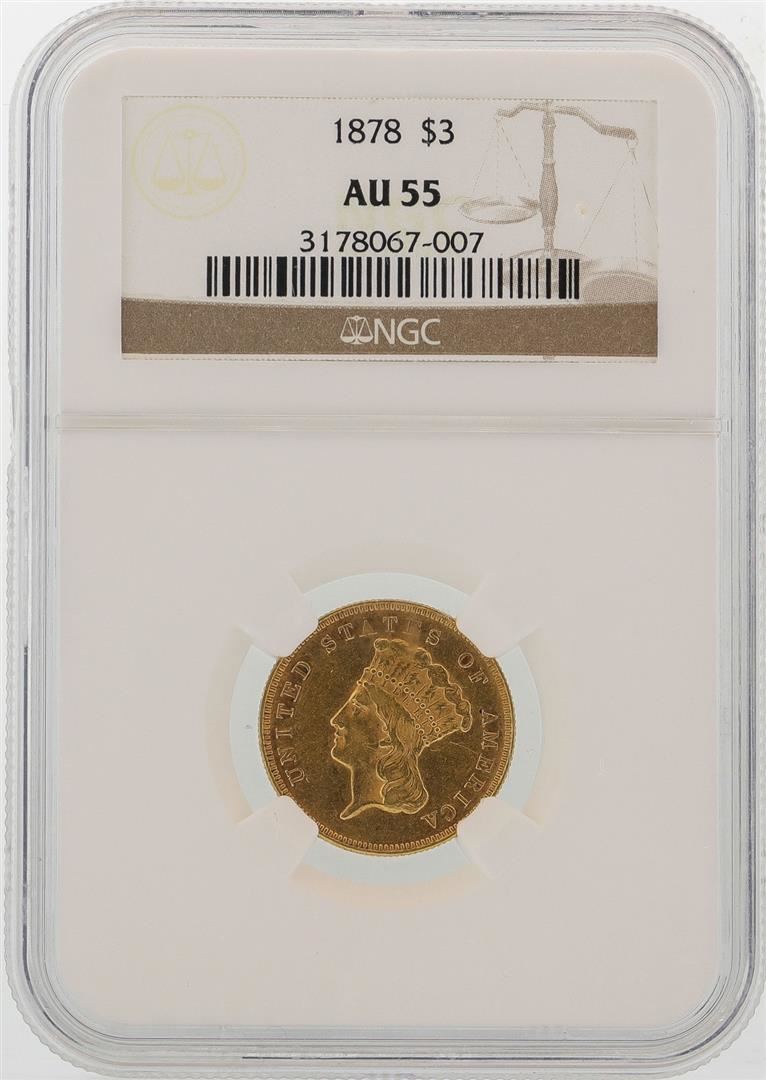 One 1878 $3 Indian Princess Head Gold Coin NGC AU55. NGC Certified.