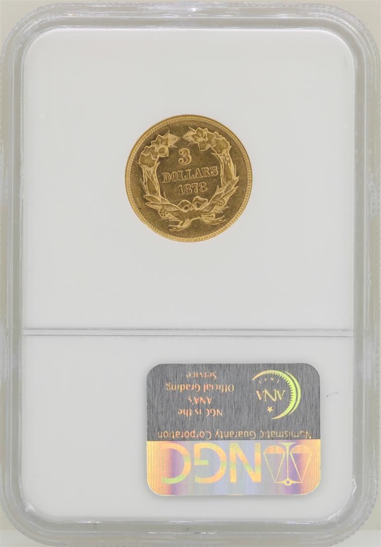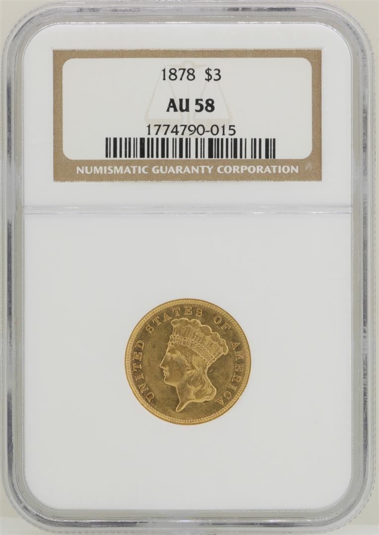 One 1878 $3 Indian Princess Head Gold Coin NGC AU58. NGC Certified.