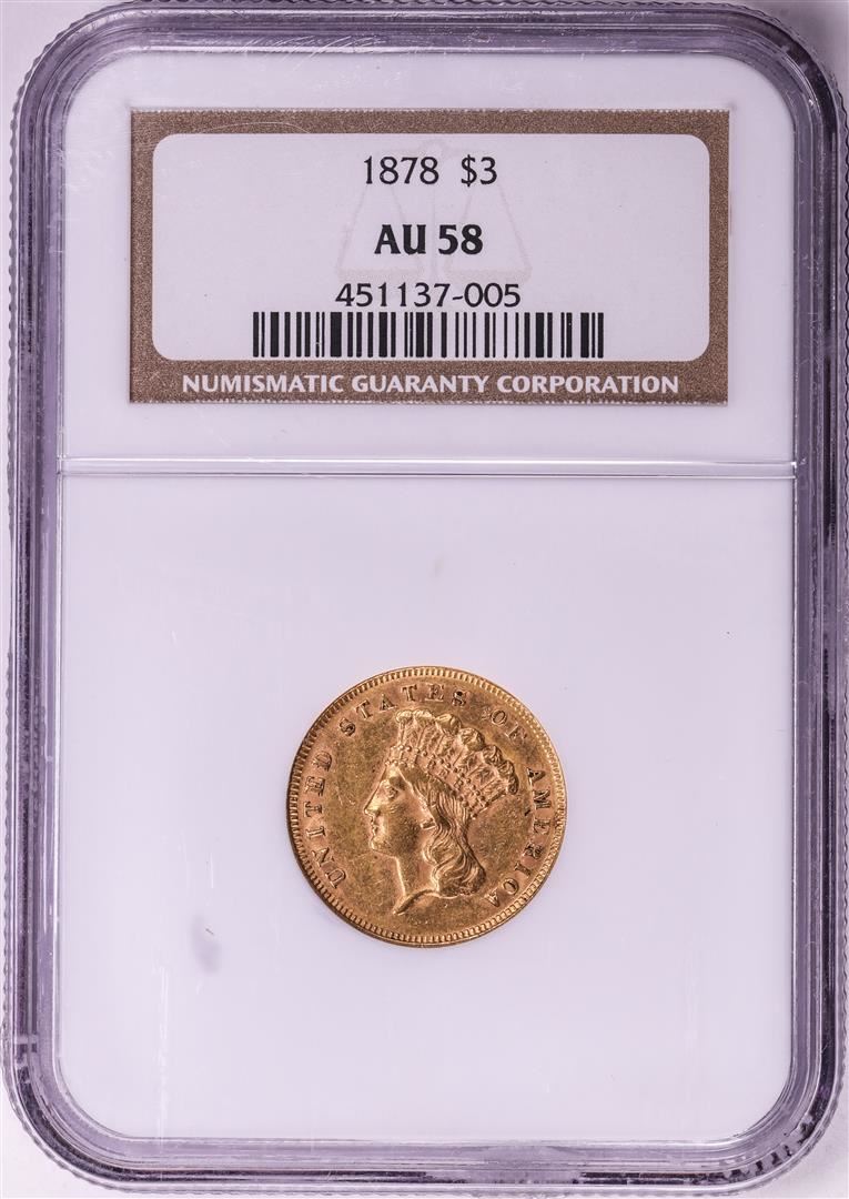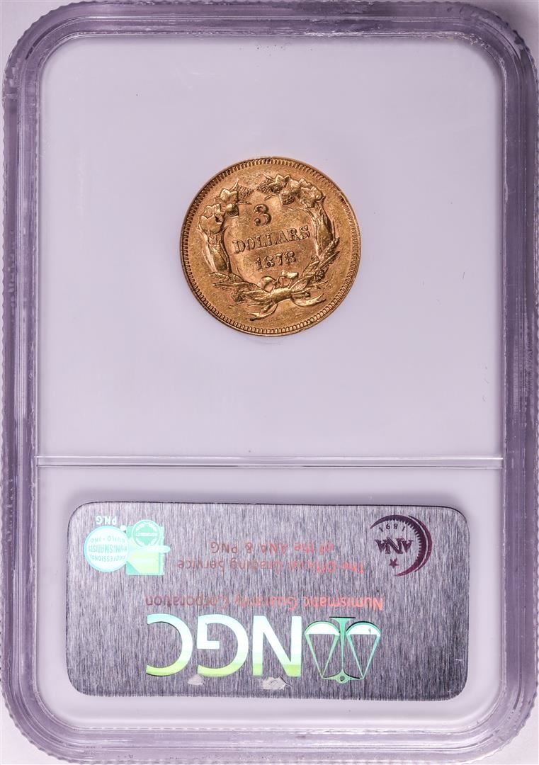 One 1878 $3 Indian Princess Head Gold Coin NGC AU58. NGC Certified.