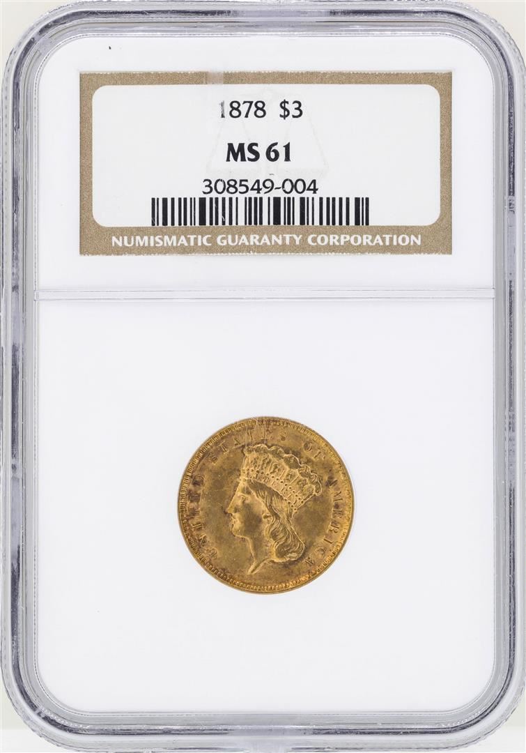 One 1878 $3 Indian Princess Head Gold Coin NGC MS61. NGC Certified.