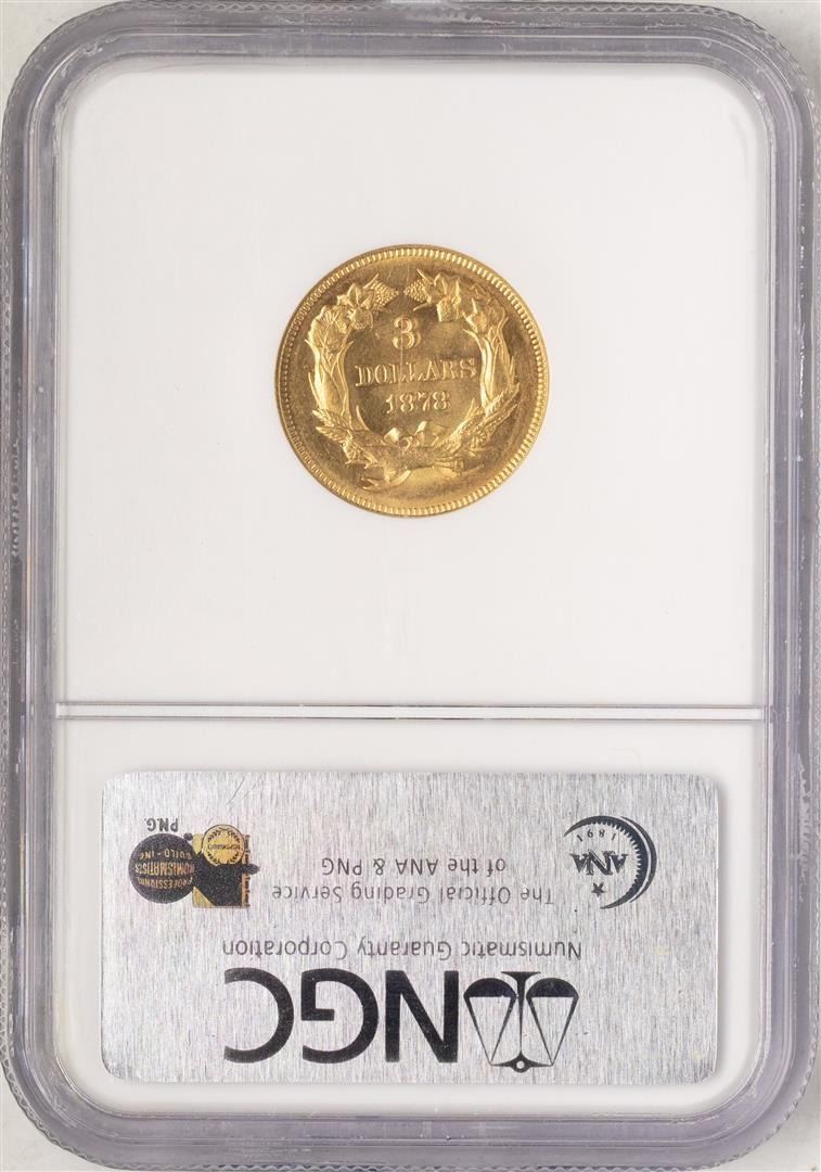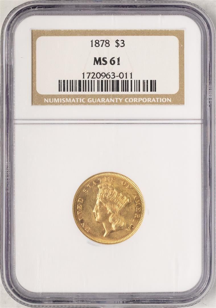 One 1878 $3 Indian Princess Head Gold Coin NGC MS61. NGC Certified.