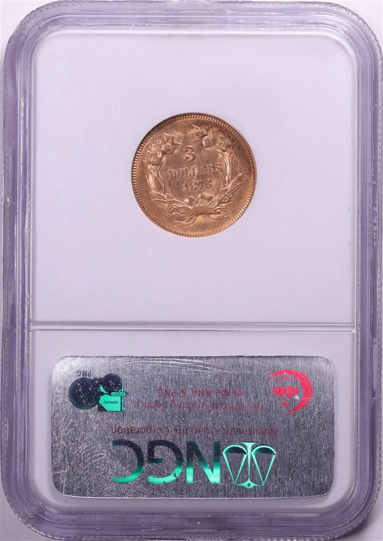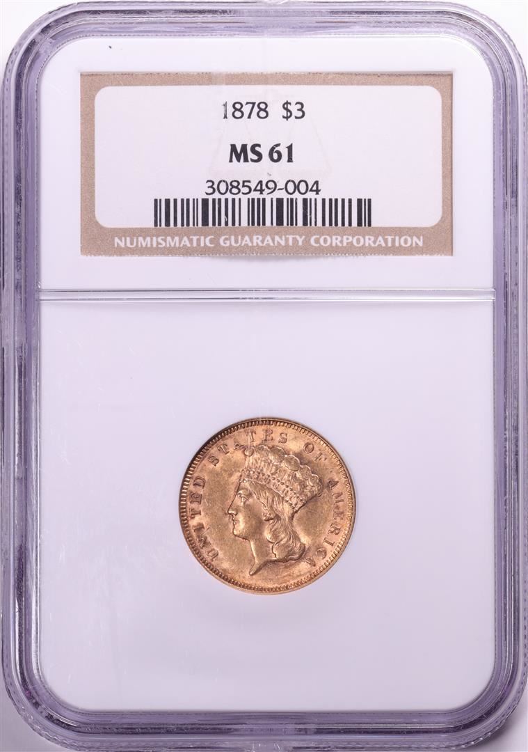 One 1878 $3 Indian Princess Head Gold Coin NGC MS61. NGC Certified.