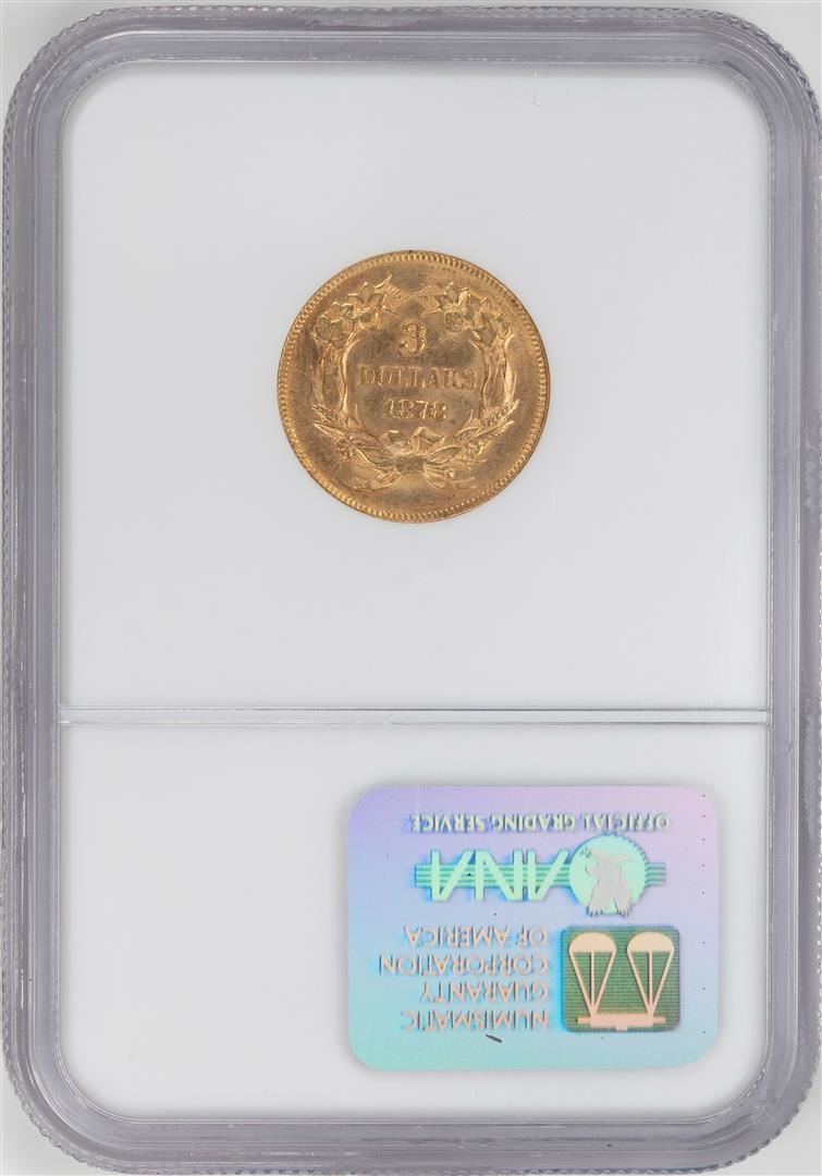 One 1878 $3 Indian Princess Head Gold Coin NGC MS62. NGC Certified.