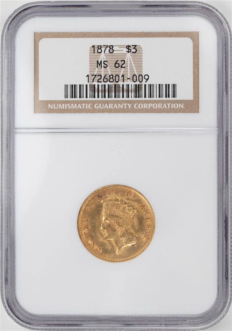 One 1878 $3 Indian Princess Head Gold Coin NGC MS62. NGC Certified.