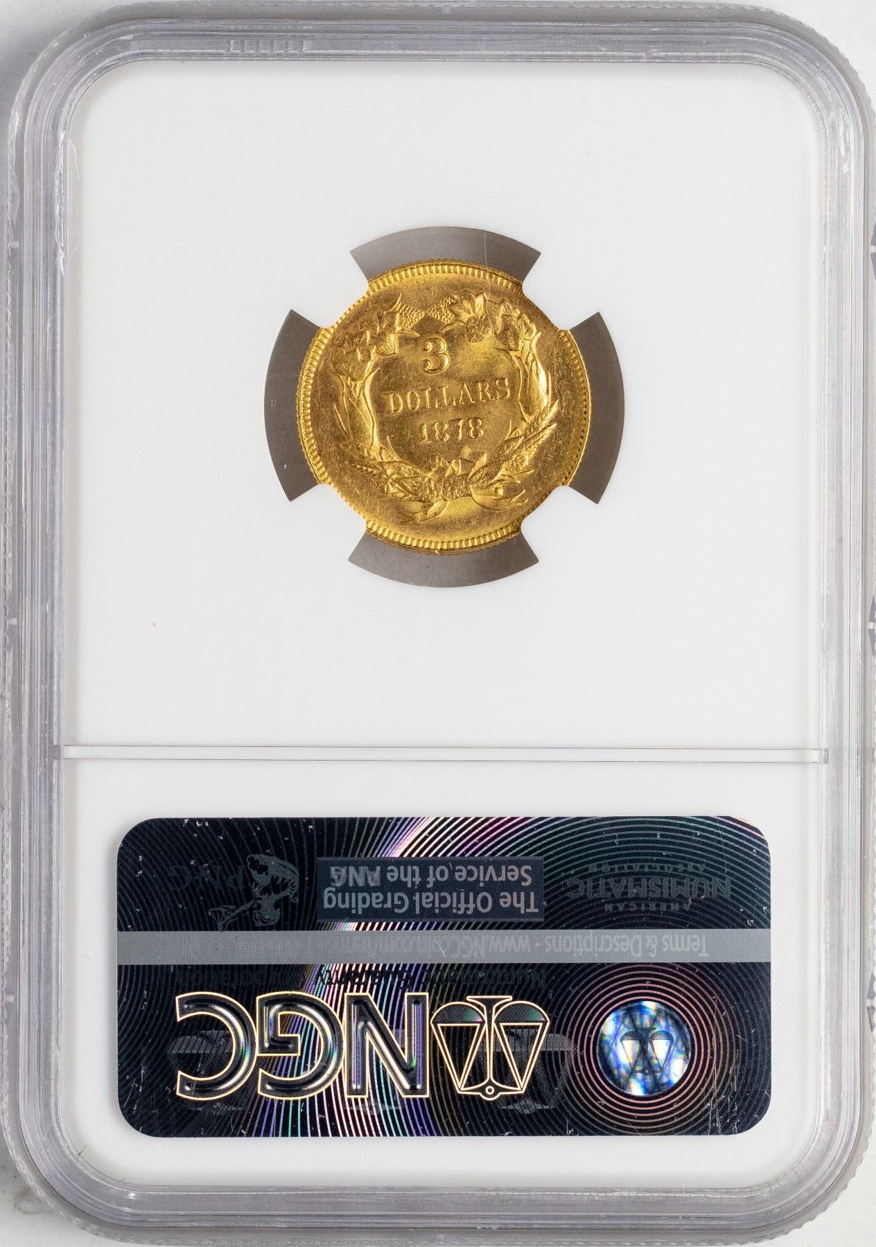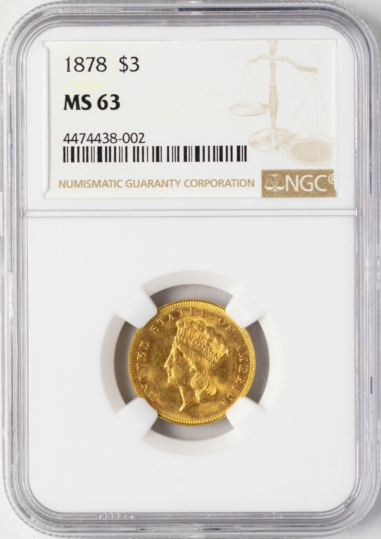 One 1878 $3 Indian Princess Head Gold Coin NGC MS63.
