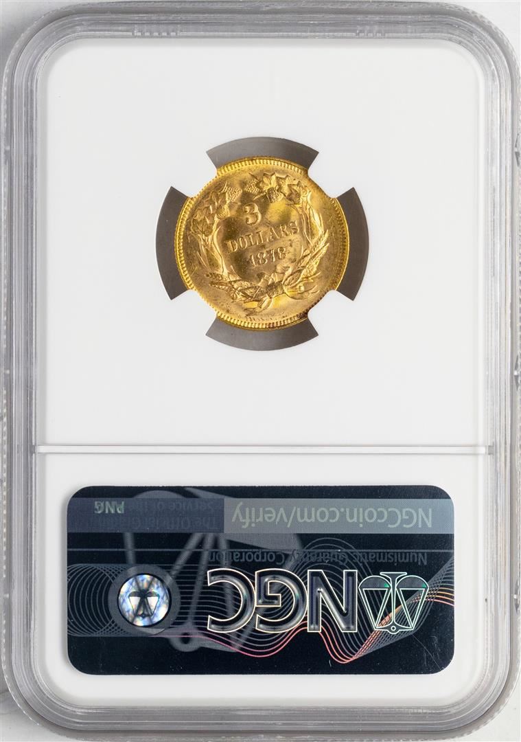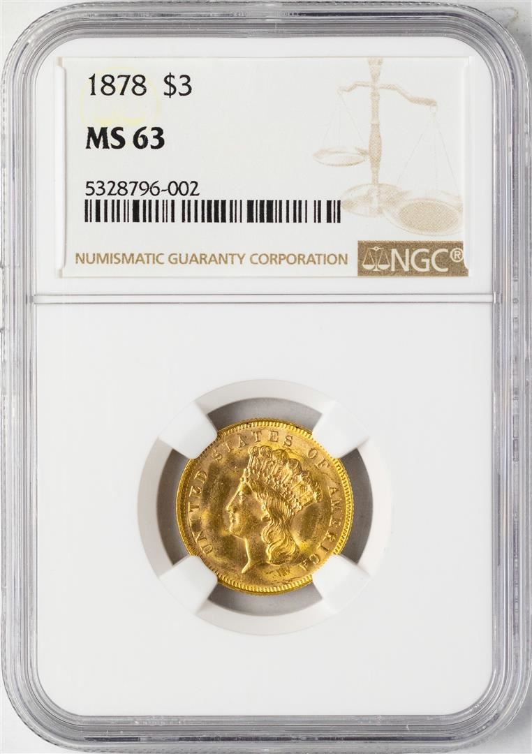 One 1878 $3 Indian Princess Head Gold Coin NGC MS63. NGC Certified.