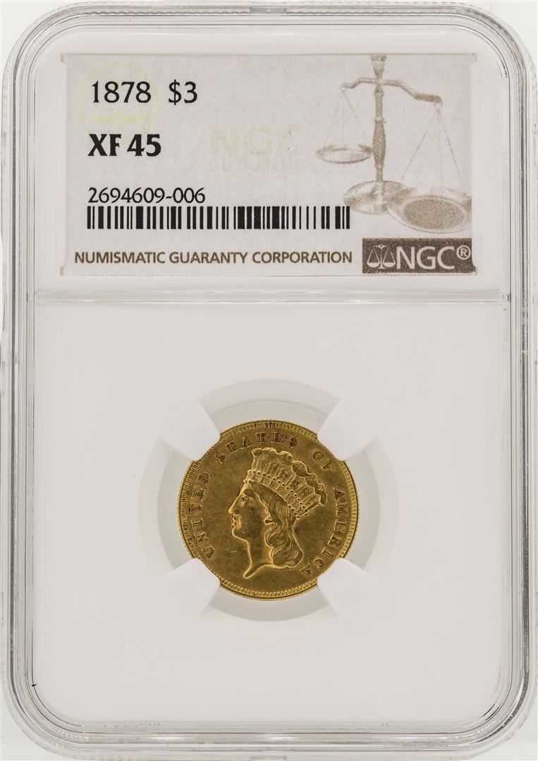 One 1878 $3 Indian Princess Head Gold Coin NGC XF45. NGC Certified.