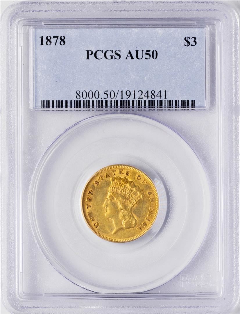 One 1878 $3 Indian Princess Head Gold Coin PCGS AU50. PCGS Graded.