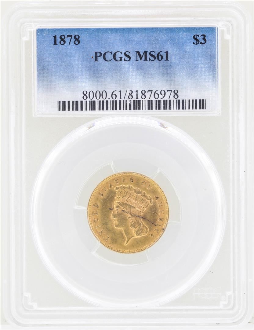 One 1878 $3 Indian Princess Head Gold Coin PCGS MS61. PCGS Graded.