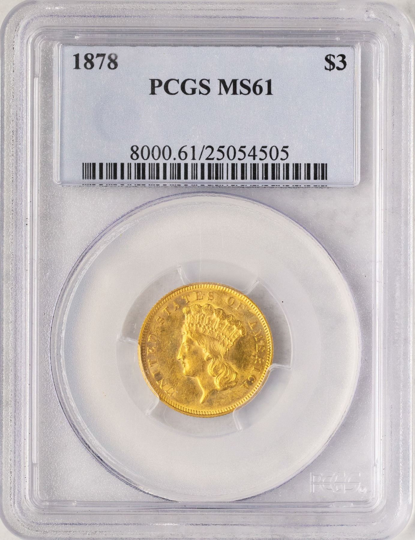 One 1878 $3 Indian Princess Head Gold Coin PCGS MS61.