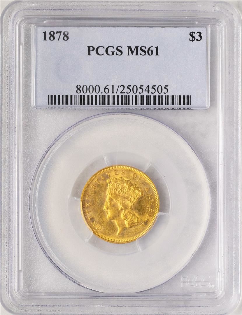 One 1878 $3 Indian Princess Head Gold Coin PCGS MS61. PCGS Graded.