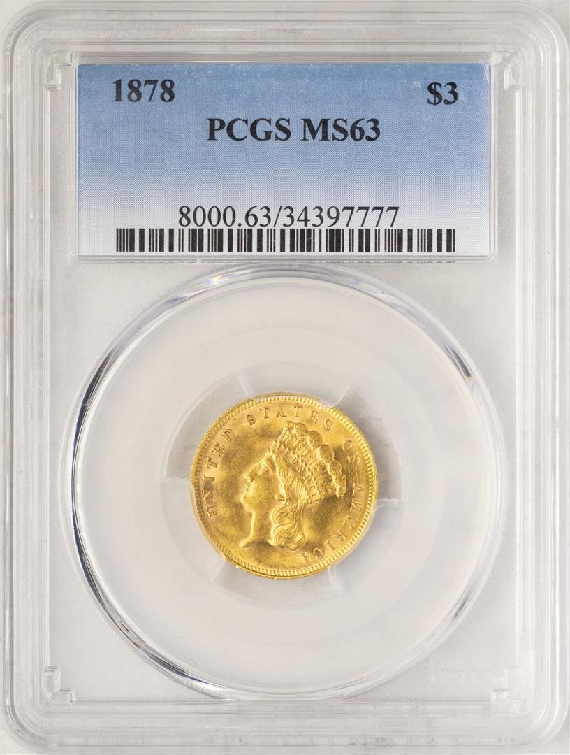 One 1878 $3 Indian Princess Head Gold Coin PCGS MS63. PCGS Graded.