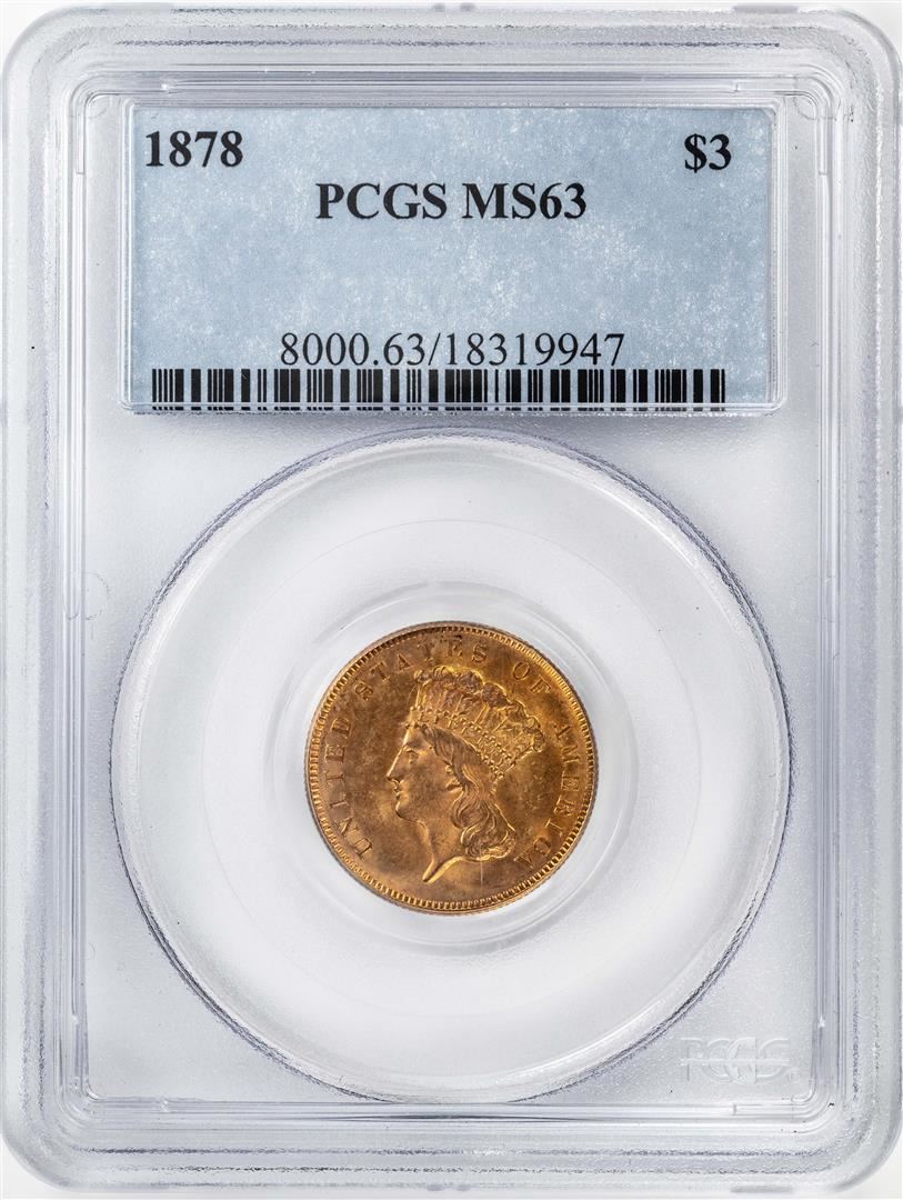 One 1878 $3 Indian Princess Head Gold Coin PCGS MS63. PCGS Graded.