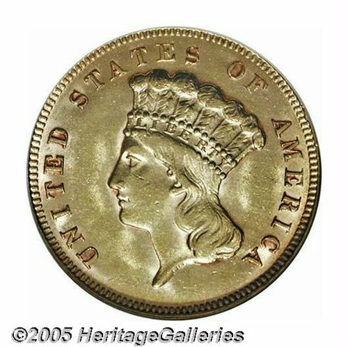 <B>1878<$3> MS60 NGC.</B></I> Fully lustrous and almost entire brilliant with some splashes of golden brown around the peripheral design elements. A substantial number of Mint State examples were set aside at the time of issue, and accordingly, high-grade survivors are regularly available for acquisition by today's generation of numismatists. Here's a pleasing specimen admirably suited for inclusion in a 19th-century gold type set.<BR><I>From the Dr. Kurt Peters Collection.</B></I> From the Dr. Kurt Peters Collection.