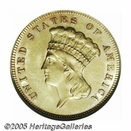 <B>1878<$3> MS61 ANACS.</B></I> An example of the second highest mintage issue, one of 82,324 examples originally coined. Only the debut 1854 issue had a mintage that exceeded 100,000 pieces. Lustrous yellow-gold surfaces with a brilliant, satiny finish. Typical weakness is noted at the ribbon bow and knot.<BR><I>From the Dr. Kurt Peters Collection.</B></I> From the Dr. Kurt Peters Collection.