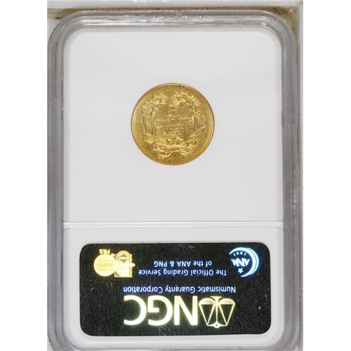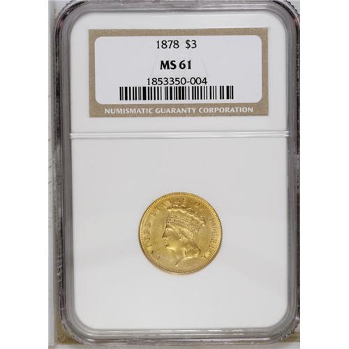 <B>1878 $3 MS61 NGC.</B></I> A lightly abraded gold type coin with reasonable luster and only a hint of blending on the device highpoints. The familiar reverse die with a recut date and minor die doubling on the upper right maple leaves. Demand for Mint State three dollar gold pieces is substantial, as it is the scarcest gold denomination apart from patterns.<BR><BR><b>Shipping:</b> Coin/Currency (<a target="_blank" href="http://www.heritageauctions.com/common/shipping.php">view shipping information</a>)