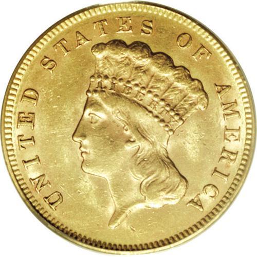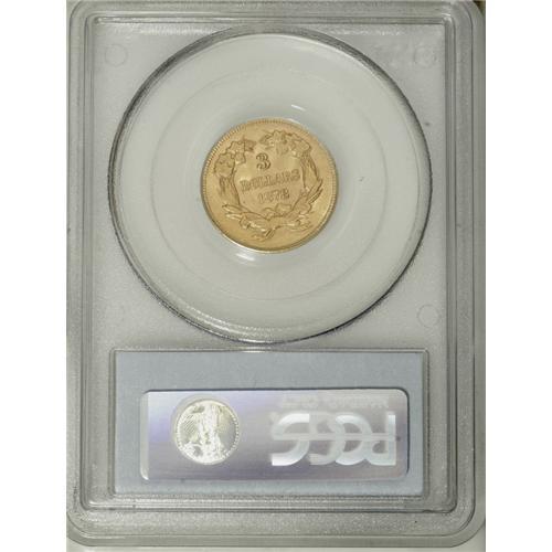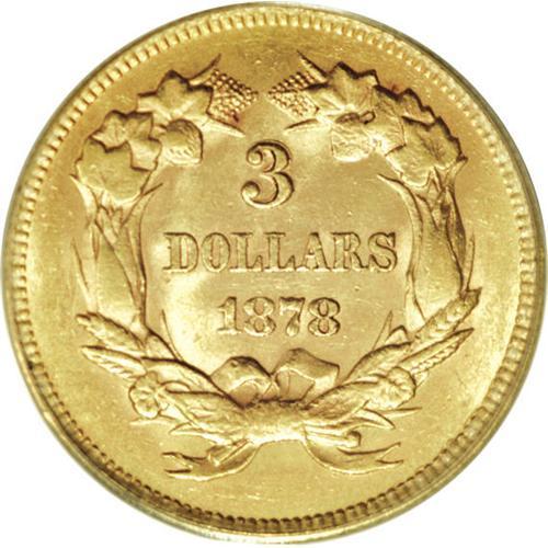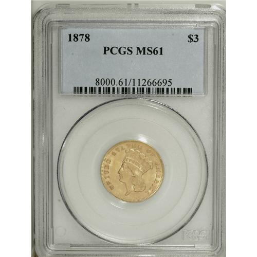 <B>1878 $3 MS61 PCGS.</B></I> Mint State three dollar gold pieces are under ceaseless demand from gold type set collectors. The 1878 is perhaps the date most often called upon to represent the denomination. This satiny green-gold example lacks individually relevant marks, and has only slight blending of detail on the highpoints of Liberty's hair.<BR><BR><b>Shipping:</b> Coins & Currency (<a target="_blank" href="http://www.heritageauctions.com/common/shipping.php">view shipping information</a>)