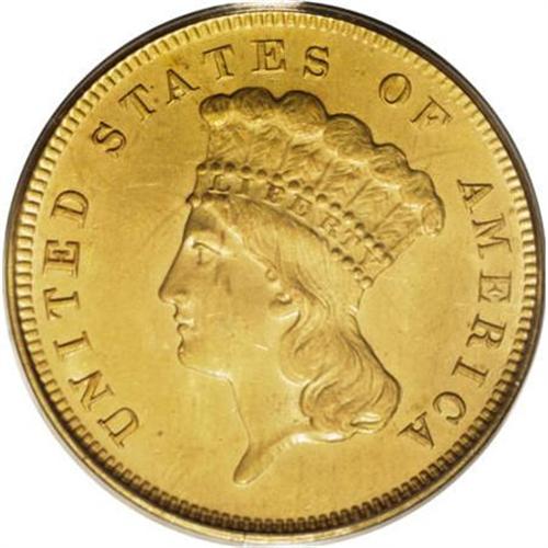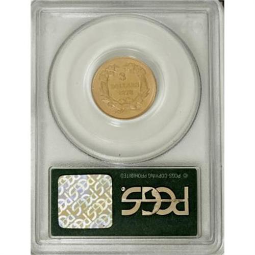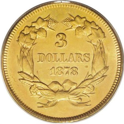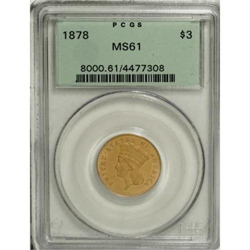 <B>1878 $3 MS61 PCGS.</B></I> A satiny gold type coin with delicate apricot and orange toning. Faint marks are found upon extensive study, but these are all well concealed. Boldly struck with full definition on the date and denomination. Lightly die doubled, visible on LARS and the right-side cotton leaves. Encapsulated in a green label holder.<BR><I>From The DAX Collection.</B></I><BR><BR><B>Coin Engraver:</B> James B. Longacre<BR><BR><b>Shipping:</b> Coins & Currency (<a target="_blank" href="http://www.heritageauctions.com/common/shipping.php">view shipping information</a>\)