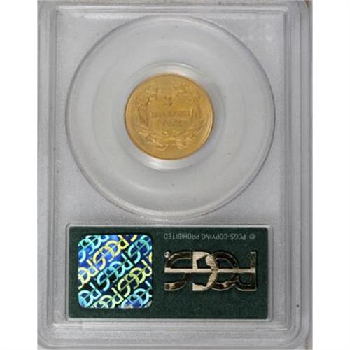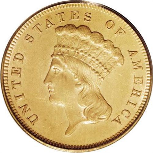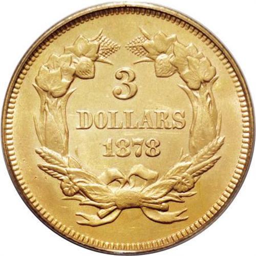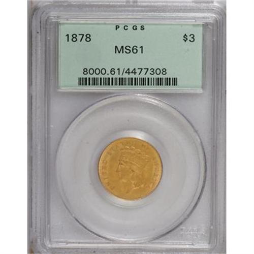 <B>1878 $3 MS61 PCGS.</B></I> A satiny gold type coin with delicate apricot and orange toning. Faint marks are found upon extensive study, but these are all well concealed. Boldly struck with full definition on the date and denomination. Lightly die doubled, visible on LARS and the right-side cotton leaves. Encapsulated in a green label holder.<BR><BR><B>Coin Engraver:</B> James B. Longacre<BR><BR><b>Shipping:</b> Coins & Currency (<a target="_blank" href="http://www.heritageauctions.com/common/shipping.php">view shipping information</a>)