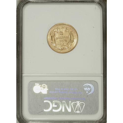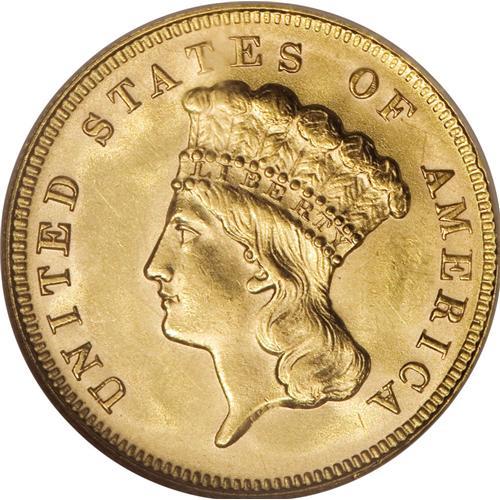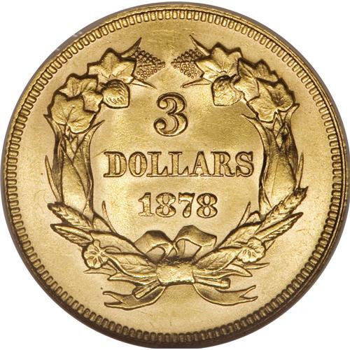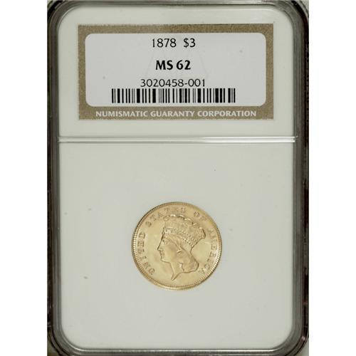 <B>1878 $3 MS62 NGC.</B></I> As the most plentiful mintage of the series save for the premiere-year 1854, the 1878 is a popular late-series choice for type collectors. The production values are also uniformly high, so that most pieces offer good aesthetics. This piece displays beautiful canary-yellow surfaces that are relatively mark-free for the grade, with radiant luster. A perfect piece for a mid-Mint State type set.<BR><BR><b>Shipping:</b> Coins & Currency (<a target="_blank" href="http://www.heritageauctions.com/common/shipping.php">view shipping information</a>)