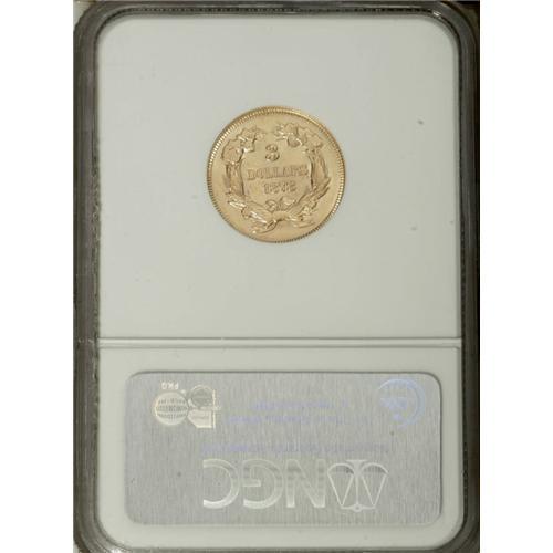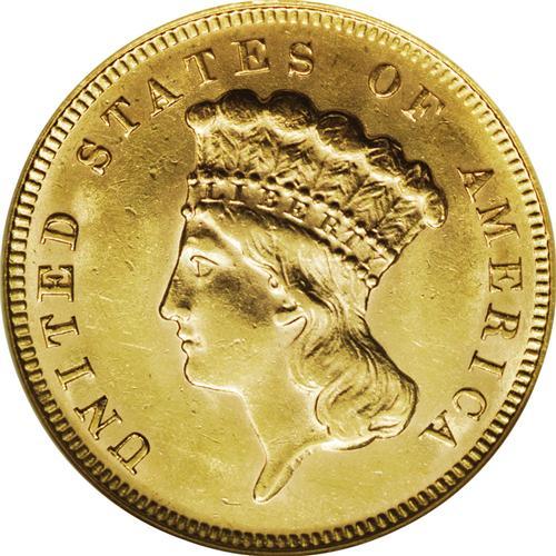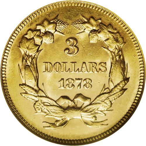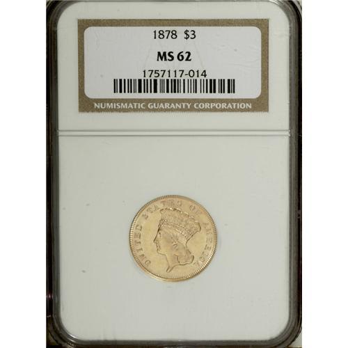 <B>1878 $3 MS62 NGC.</B></I> In addition to its availability as a three dollar type coin, the 1878 is also notable for its bright mint luster. This is a pleasing yellow-gold example that has a light overlay of pale reddish patina. The details are well, but not fully struck. There are only minor abrasions present to account for the grade.<BR><BR><b>Shipping:</b> Coins & Currency (<a target="_blank" href="http://www.heritageauctions.com/common/shipping.php">view shipping information</a>)