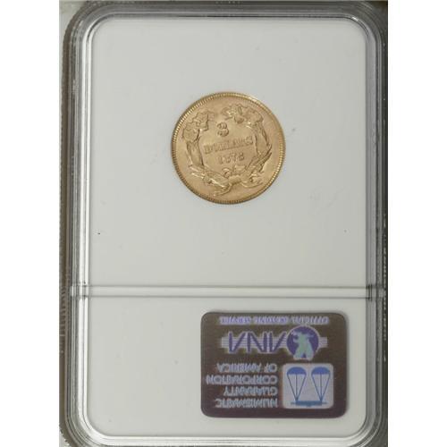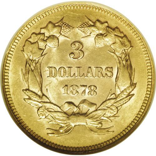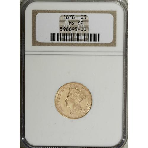 <B>1878 $3 MS62 NGC.</B></I> The 1878 three dollar had an exceptionally high mintage of 82,304 pieces--struck in anticipation of the general public exchanging paper currency for gold. As a result, much of the mintage of this issue lay in bank vaults for years, and today the 1878 is the most frequently encountered date in the series. This piece shows the usual strong mint frost. The striking details on this piece are a bit soft, and there are numerous small abrasions scattered about but none are worthy of singular mention.<BR><I>From The Jones Beach Collection.</B></I><BR><BR><b>Shipping:</b> Coin/Currency (<a target="_blank" href="http://www.heritageauctions.com/common/shipping.php">view shipping information</a>)