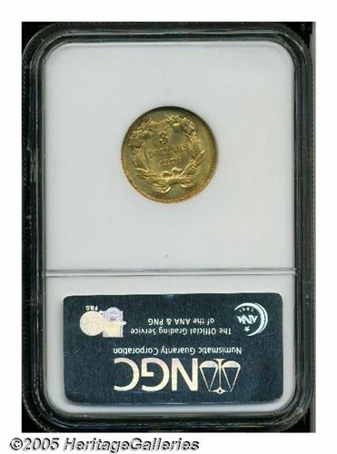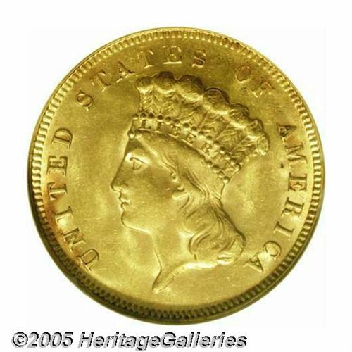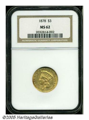 <B>1878<$3> MS62 NGC.</B></I> Very well defined for this most available Three Dollar issue, with swirling, satiny luster and pronounced brick-red accents on each side. Minimally marked for the grade.