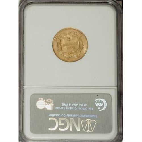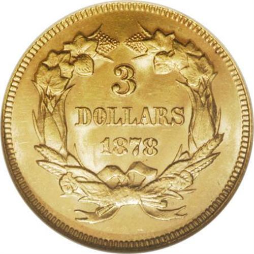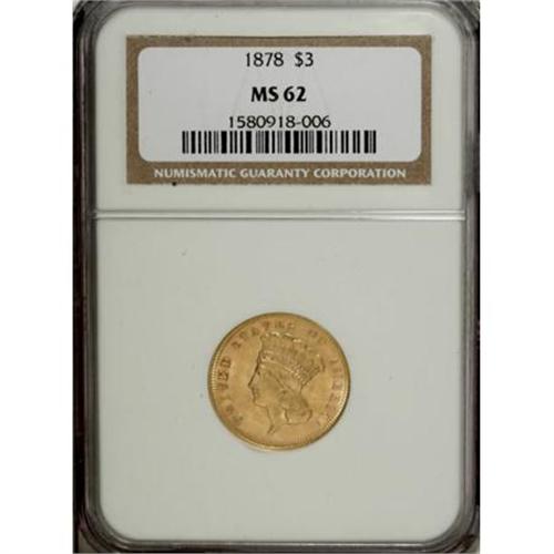 <B>1878 $3 MS62 NGC.</B></I> The 1878 is easily the most common three dollar piece, despite the substantially higher mintage of 1854. Frosty yellow-gold luster on both sides is enhanced by traces of pink toning. Nearly all design elements are bold, with weak details limited to the ribbon bow.<BR><BR><B>Coin Engraver:</B> James B. Longacre<BR><BR><b>Shipping:</b> Coins & Currency (<a target="_blank" href="http://www.heritageauctions.com/common/shipping.php">view shipping information</a>\)